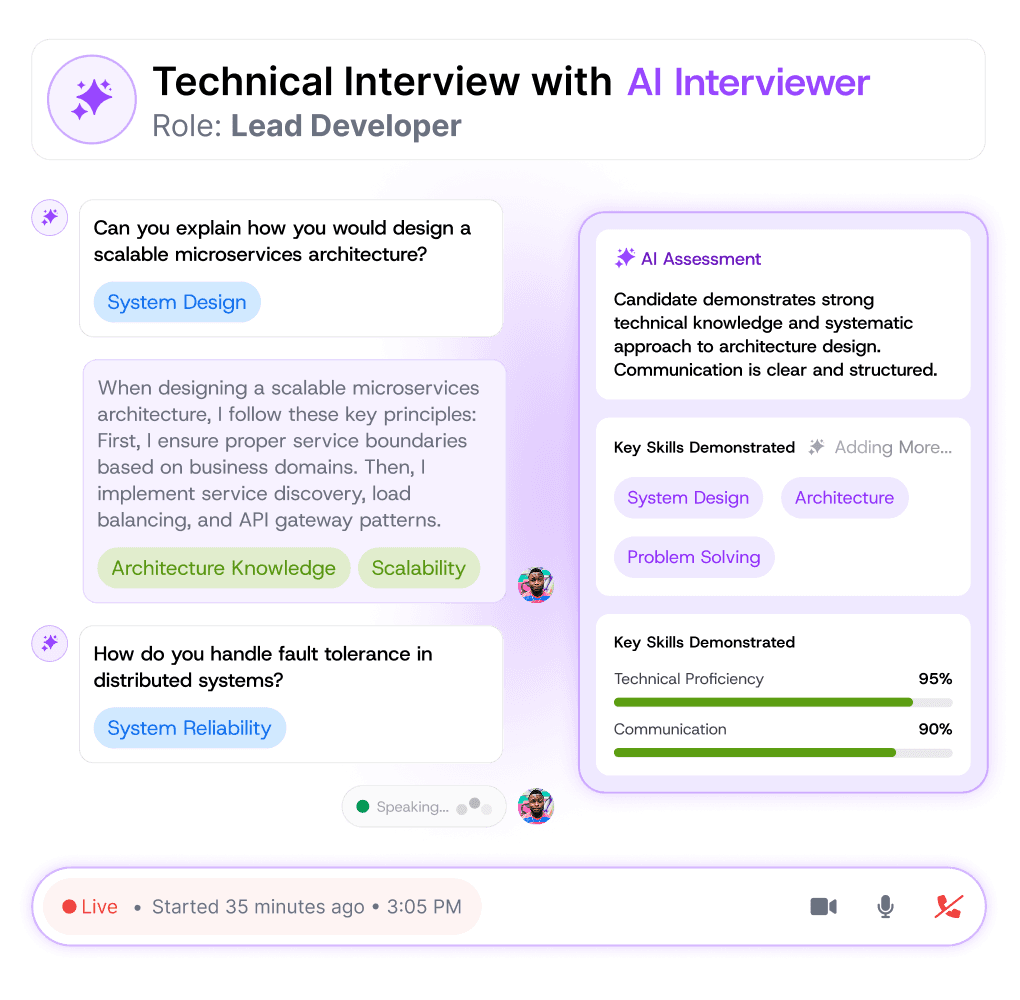 Engage candidates with natural, human-like dialogue. Our AI customizes questions based on job role and location, providing real-time feedback to ensure fair evaluation for all applicants.