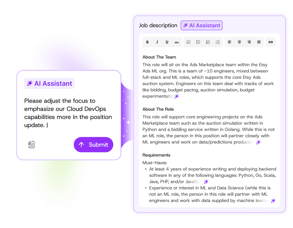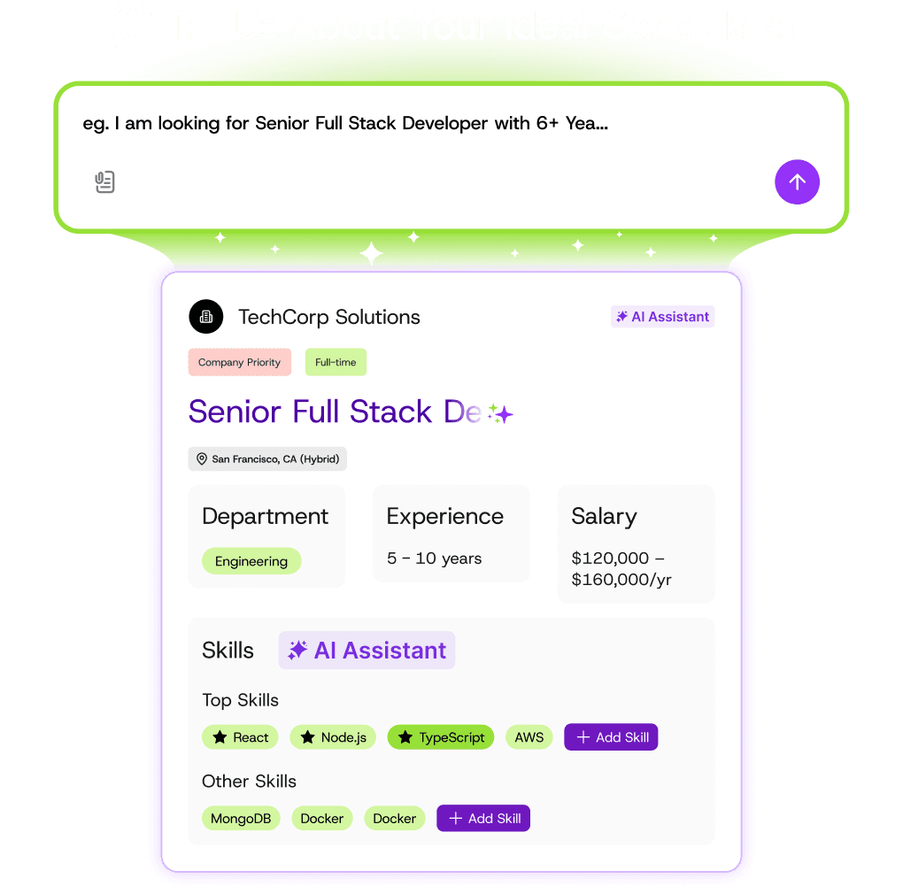 Our cutting-edge AI technology crafts precise, engaging role descriptions that attract top talent and streamline your entire hiring process.